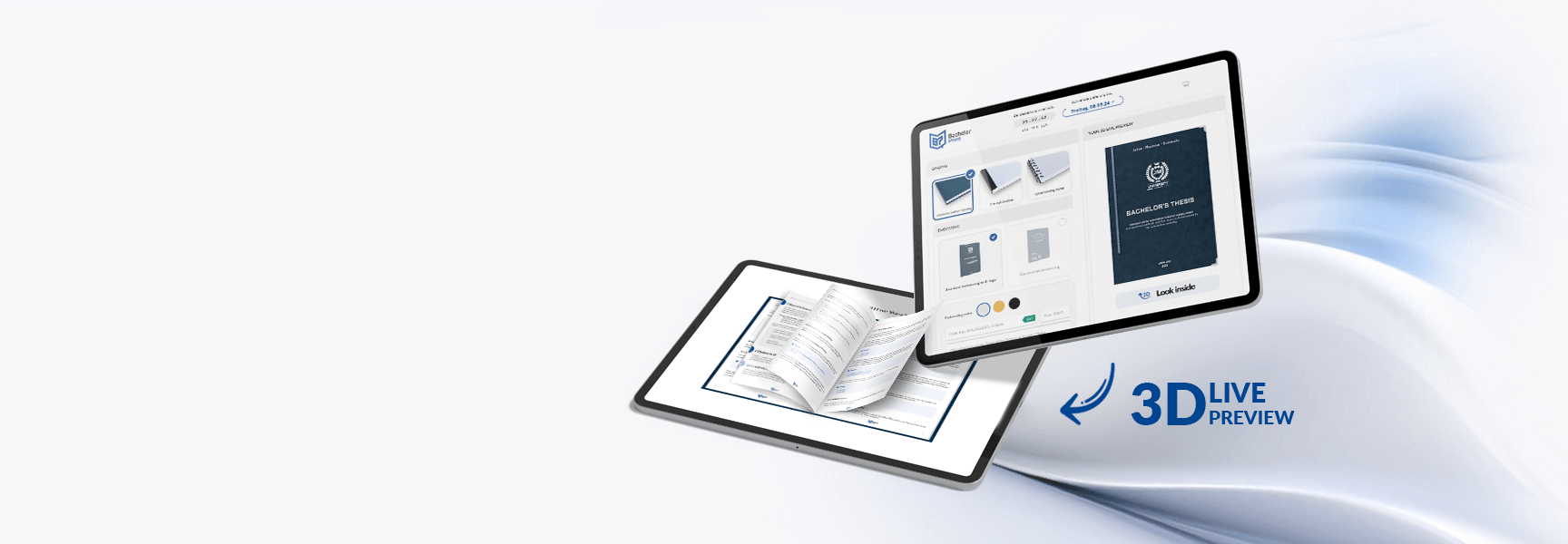 With the 3D live preview, you can view your individually designed binding online and see all adjustments live. You can also use the final format revision to check every page for formatting errors before you place your order.